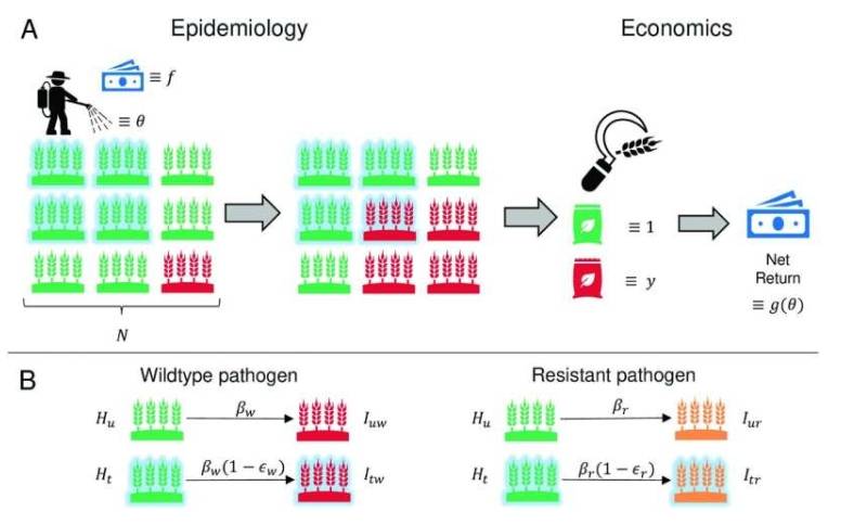 في هذا البحث، استخدم الباحثون نموذجًا قابلًا للحساب يغطي انتشار الأمراض الفطرية عبر مجالات متعددة، مع دمج طرق التحليل الاقتصادي، لبناء إطار رياضي جديد تمامًا. أشار البروفيسور Chaitanya Gokhale من JMU إلى أن التكاليف الاقتصادية لمقاومة المبيدات الفطرية يصعب تحديدها، حيث يمكن أن يزيد أو ينقص الإنتاج حسب الظروف المحددة، وأن التكاليف المرتبطة بالمقاومة تكون الأعلى مع مسببات الأمراض ذات الغزو المتوسط. كما اكتشف البحث أنه على الرغم من أن التكلفة الاقتصادية الإجمالية قد تبدو منطقيًا أنها ترتفع مع زيادة المقاومة وخسائر الإنتاج، إلا أن التكلفة الإجمالية تنخفض فعليًا عندما ترتفع أسعار المبيدات الفطرية. بالإضافة إلى ذلك، تؤثر عوامل بيولوجية مثل درجة مقاومة مجموعة مسببات الأمراض، والعدد التناسلي الأساسي، وخسائر الإنتاج في الحقول الناتجة عن العدوى الفطرية، على التكاليف.