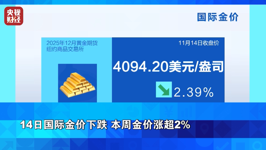 في مجال المعادن النفيسة، أدى تراجع توقعات المستثمرين بخفض مجلس الاحتياطي الفيدرالي لأسعار الفائدة إلى انخفاض أسعار الذهب. وبحلول الإغلاق، أغلق عقد الذهب لشهر ديسمبر في بورصة نيويورك للسلع عند 4,094.20 دولارًا للأونصة، بانخفاض 2.39%. أما هذا الأسبوع، فقد ارتفعت أسعار الذهب الدولية بنسبة تراكمية 2.10%.